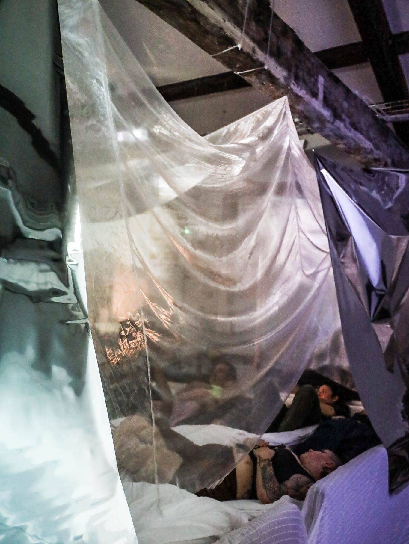 “SPUME is a multisensory installation blending reflected light, immersive sound, and tactile encounters. At its centre is a soft seabed where you’re invited to lie down, absorb healing frequencies, and practice the art of horizontalism — gazing upward through a shimmering surface where glass buoys drift and scatter light across the space.