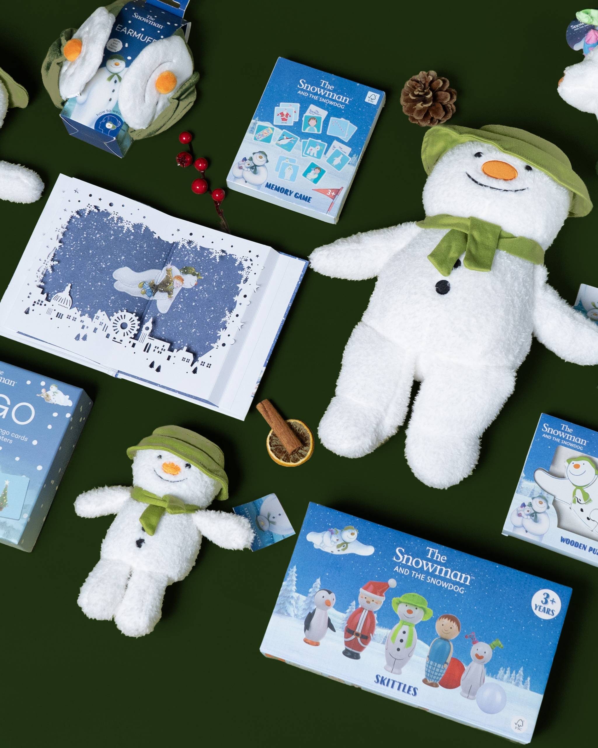 Very cuddly Snowman and Snowdog teddies, storybooks, skittles, and cosy earmuffs – guaranteed to melt your heart.